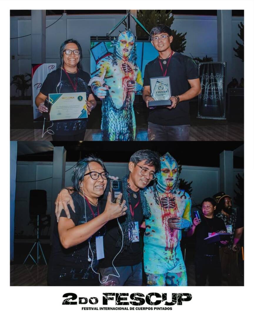 Recientemente acaban de ganar el primer puesto en el II CONCURSO INTERNACIONAL DE CUERPOS PINTADOS (FESCUP 2024), desarrollado los días 15, 16 y 17 de marzo en la ciudad de Trujillo organizado por Casa Mística. Ambos artistas presentaron al Yacuruna, personaje mítico del Carnaval del achiote.