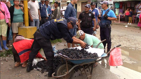 Moyobamba. Un efectivo de la Policía Municipal de Moyobamba fue obligado a recoger las uvas esparcidas de una carretilla durante una intervención, el hecho se registró en la esquina de los jirones 25 de Mayo con Serafín Filomeno altura del mercado central.