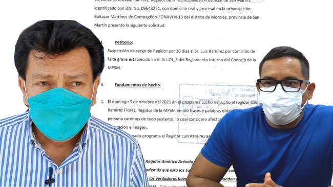 El regidor de la Municipalidad Provincial de San Martín, Américo Arévalo Ramírez, ha solicitado a través de un documento remitido a miembros del consejo, la suspensión por 30 días de su colega Luis Ramírez por comisión de falta grave establecido en el Reglamento interno del consejo Art. 24.