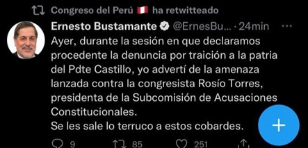 Los congresistas de Fuerza Popular Ernesto Bustamente y Alejandro Aguinaga afirmaron textualmente que lo ocurrido con la madre de Rosio Torres tenía que ver directamente con la denuncia constitucional aprobada contra el presidente. «Ayer (lunes), durante la sesión en que declaramos procedente la denuncia por traición a la patria del Pdte Castillo, yo advertí de la amenaza lanzada contra la congresista Rosío Torres, presidenta de la Subcomisión de Acusaciones Constitucionales. Se les sale lo terruco a estos cobardes», afirmó Bustamente.