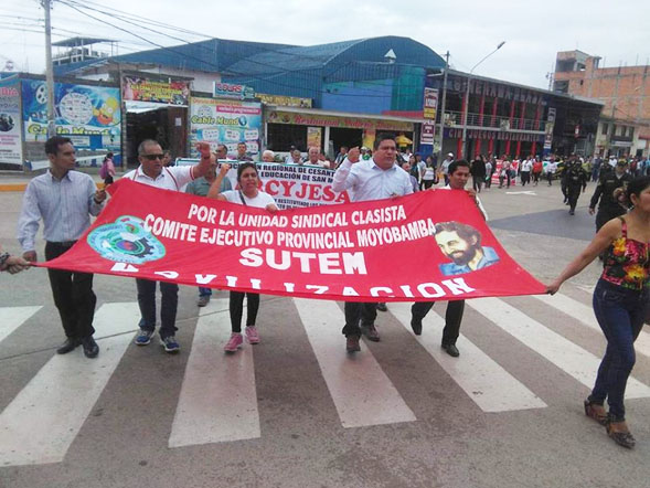 Moyobamba. En el Día del Maestro, 500 docentes de la provincia de Moyobamba marcharon por las principales calles exigiendo mejoras salariales, las delegaciones provenientes de distintas instituciones educativas recorrieron las arterias junto a dirigentes provinciales y regionales del Sindicato Único de Trabajadores en la Educación del Perú (SUTEP).