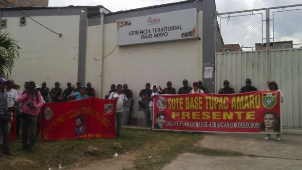 Profesores en huelga de la provincia de San Martín, realizaron un plantón en la sede de la Subregión Bajo Mayo del Gobierno Regional de San Martín, exigiendo el pago de la deuda social.