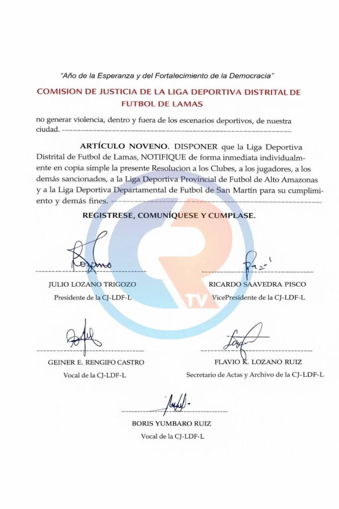 La resolución lleva la firma del presidente de la Comisión de Justicia, Julio Lozano Trigozo, el vicepresidente Ricardo Saavedra Pisco, y los miembros Geiner E. Rengifo CastroFlavio K. Lozano Ruiz y Boris Yumbaro Ruiz, quienes además exhortaron a todos los actores deportivos a preservar la integridad del sistema y evitar nuevos hechos de violencia dentro y fuera de los escenarios deportivos.