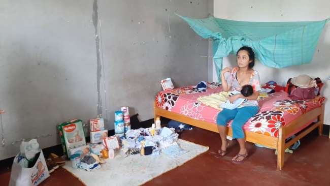 Mirian Montenegro Tuanama de 25 años de edad dijo que no puede trabajar porque tiene que atender a su pequeño, mientras que su conviviente, de nombre Jerson Vásquez está como no habido. La joven vive en la segunda cuadra del jirón Manco Inca en la urbanización 9 de abril de Tarapoto en una pequeña habitación, hasta el lugar llegaron las socias de Manos Unidas con ayuda económica, víveres, leche, pañales, cocina y dos balones de gas para que pueda preparar sus alimentos.