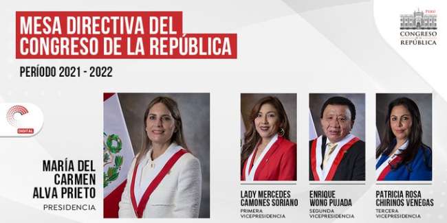 La congresista María del Carmen Alva (Acción Popular), de la lista 2, ganó la presidencia de la Mesa Directiva del Congreso para el periodo 2021-2022 con 69 votos.