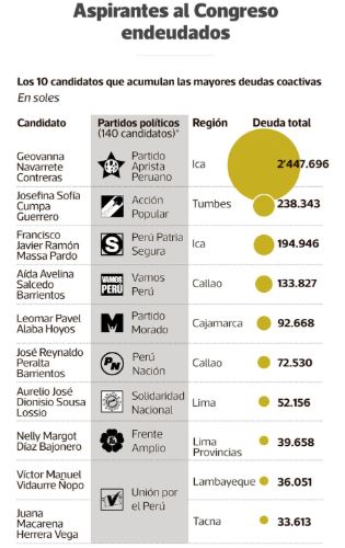 En el registro también figura la aspirante al Legislativo Leomar Alaba Hoyos del Partido Morado por Cajamarca, quien tiene la suma 92 mil 668 soles pendientes a pagar, y José Peralta Barrientos de Perú Nación por el Callao aún no cancela su deuda de 72 mil 530 soles.