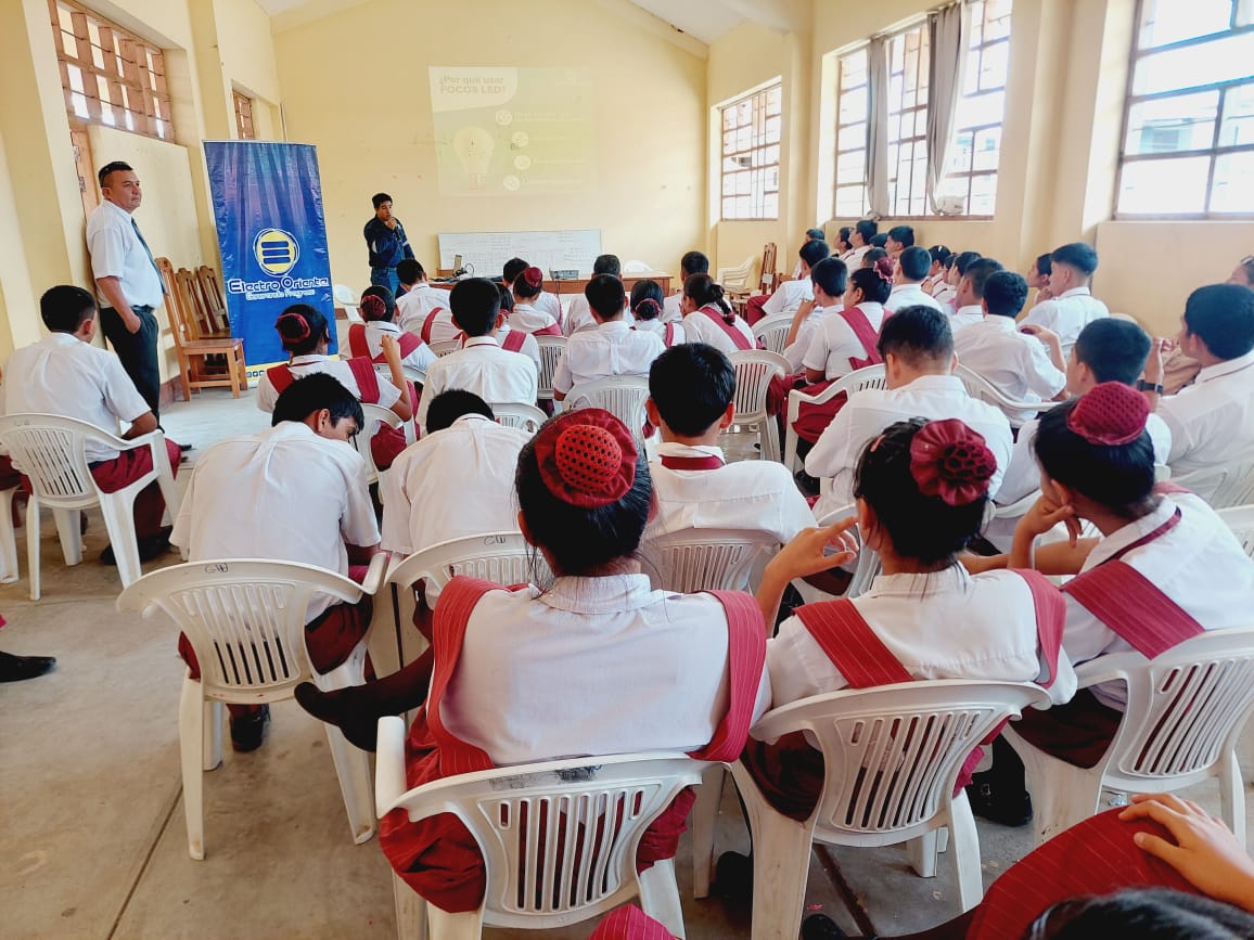 El Ing. Fernando Pinedo López, Supervisor del Servicio Eléctrico Juanjuí, fue el encargado de brindar la capacitación a más de 600 alumnos del 3er, 4to y 5to año de secundaria, compartiendo su conocimiento con los asistentes para fomentar una cultura de seguridad y eficiencia energética.