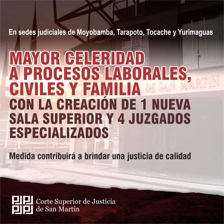 “El objetivo es descargar la gran cantidad de expedientes que hay a nivel del distrito judicial, en el caso de la especialidad laboral estos órganos jurisdiccionales funcionarán en 2 provincias y van a permitir una justicia de calidad de acuerdo a los principios de celeridad de la Nueva Ley Procesal del Trabajo (NLPT) y del proceso contencioso administrativo, laboral y previsional; en el caso de la especialidad familia estos órganos jurisdiccionales funcionarán en 2 provincias de nuestra jurisdicción, así como una nueva Sala Superior con competencia funcional en civil, familia y laboral”, indicó.