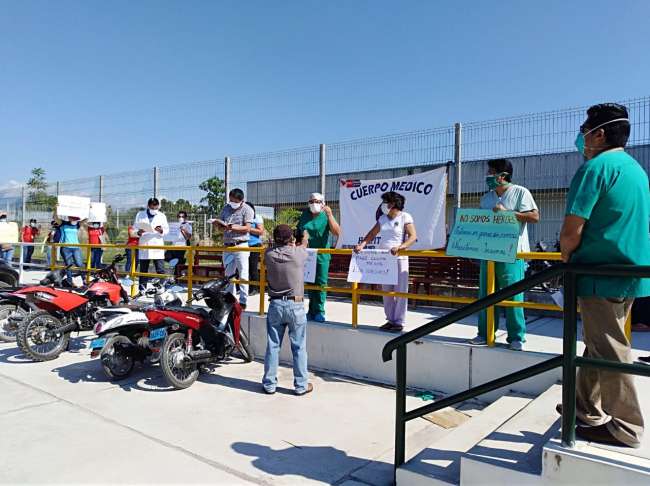 Denunciando el recordé del presupuesto que le corresponde a este nosocomio y serias deficiencias para enfrentar la pandemia; el cuerpo de médicos del Hospital II-I de Rioja, la mañana de ayer lunes realizaron una protesta; los manifestantes portando pancartas solicitaron la inmediata intervención de las autoridades del Ministerio de Salud y el Gobierno Regional.