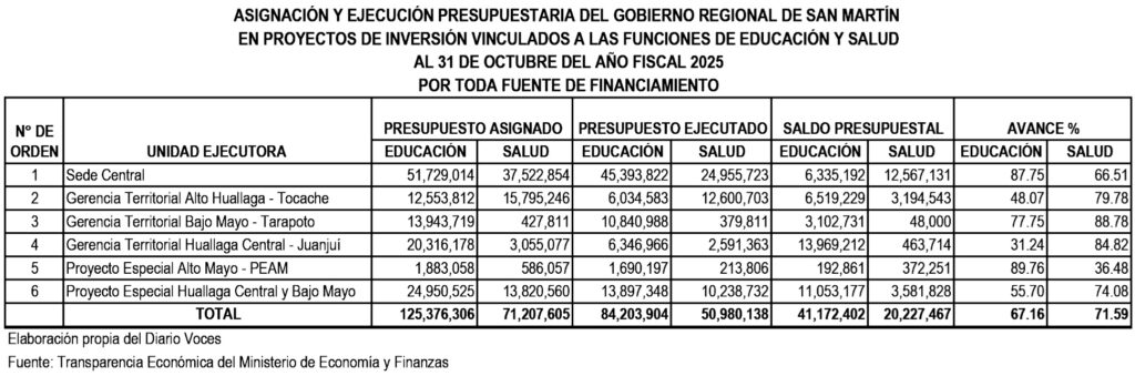 El Gobierno Regional de San Martín ha revelado su balance de asignación y ejecución presupuestaria en proyectos de inversión vinculados a las críticas funciones de Educación y Salud al 31 de octubre del año fiscal 2025. Estos datos, que abarcan la inversión con toda fuente de financiamiento, ofrecen una radiografía en dos sectores claves donde la región enfrenta significativos desafíos, como el déficit en infraestructura educativa y problemas en infraestructura y atención primaria de salud pública.