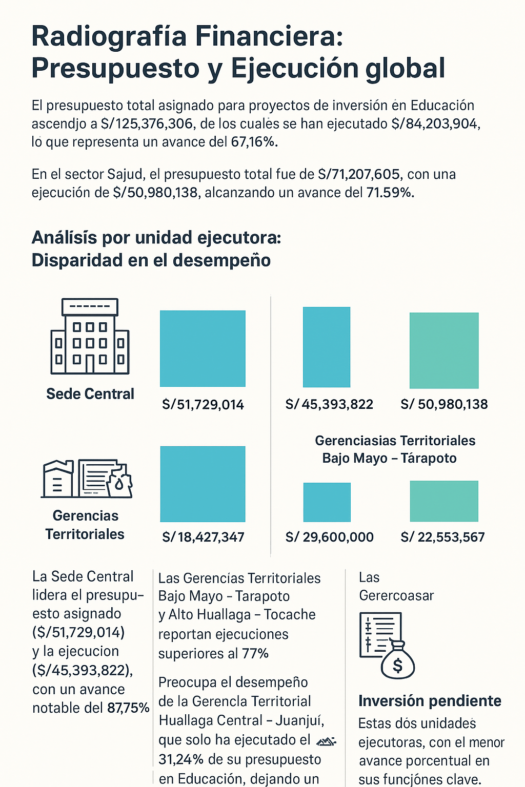 El balance es de esfuerzo palpable, pero de ejecución desigual. Si bien la región ha logrado ejecutar más de S/ 135 millones en ambos sectores, la subsistencia de saldos presupuestales millonarios, especialmente en unidades clave como la Gerencia Territorial Huallaga Central en Educación y el PEAM en Salud, sugiere que la región no está maximizando la oportunidad de inversión para cerrar las brechas de infraestructura y atención primaria que tanto afectan a la población. Cada sol no ejecutado al 100% es una demora en la entrega de una mejor aula o un centro de salud adecuado.