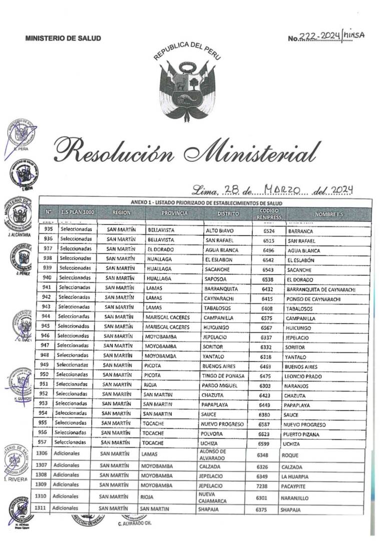 El referido documento publicado en el diario oficial “El Peruano”, indica que, dentro de los 1329, los establecimientos seleccionados para el “Plan Mil” del Minsa en la región San Martín son: Jepelacio, Soritor, Yantaló en Moyobamba; Naranjos en Rioja; Barranca, San Rafael en Bellavista; Agua Blanca en El Dorado; El Eslabón, Sacanche, El Dorado en Huallaga; Barranquita de Caynarachi, Pongo de Caynarachi, Tabalosos en Lamas; Campanilla, Huicungo en Mariscal Cáceres; Buenos Aires, Leoncio Prado en Picota; Chazuta, Papaplaya, Sauce en San Martín; y Nuevo Progreso, Puerto Pizana y Uchiza en Tocache.