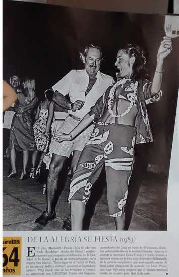 Ese año, “Marianito Prado -Hijo de Mariano Prado Heudebert-, dueño del Banco Popular, organizó una simpática celebración en la localidad de “El Sauce”, al pie de su hermosa laguna, en la región San Martín. “Este lugar es el Tahití del Perú, es un espacio bello y exótico”, comentó el legendario tablista Pitty Block, uno de los invitados al evento, en entrevista con CARETAS, Hasta ahí llegaron, procedentes de Lima en vuelo de 45 minutos, distintas personalidades de la sociedad limeña. Como es el caso de la baronesa Elena Tricoli y Alfredo Granda, a quien vemos en la foto muy divertidos disfrutando de la cumbia sanjuanera que sonó aquella noche.