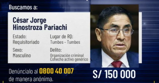 El Ministerio del Interior (Mininter) informó que está ofreciendo una recompensa de 150 mil soles por información relevante que contribuya con la captura de César Hinostroza Pariachi quien se encuentra investigado por el presunto delito de cohecho activo genérico en la modalidad de organización criminal por el caso de Los Cuellos Blancos.