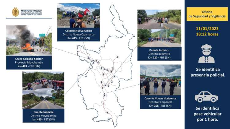 Al respecto, se detalló que, de acuerdo a reportes fiscales y de la Policía Nacional, la vía nacional Fernando Belaúnde Terry permanece bloqueada a la altura del caserío Nueva Unión, en el distrito de Nueva Cajamarca, Rioja; así como en el cruce entre los distritos de Calzada y Soritor, y el puente Indoche, en la provincia de Moyobamba.