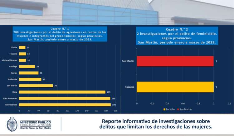 El reporte evidencia un total de 788 investigaciones en curso por el delito de agresiones, del cual 72 casos ya fueron resueltos y 616 aún se encuentran en etapas de investigación o con formalización de acusación, tanto en la región San Martín como en la provincia de Alto Amazonas, Loreto. Asimismo, se tiene registrado 2 feminicidios cometidos el mes de enero, en las ciudades de Tarapoto y Tocache.