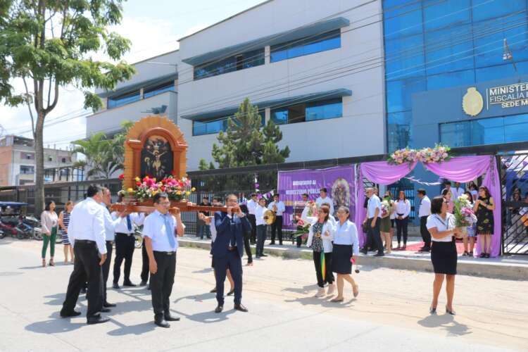 El Ministerio Público acogió por primera vez a la imagen del Señor de los Milagros para su veneración en las instalaciones de la sede central del Distrito Fiscal de San Martín, Moyobamba, por iniciativa de la prelatura de Moyobamba que este año incluye a las instituciones públicas en las festividades de devoción católica que se celebran en el mes de octubre, a nivel nacional.