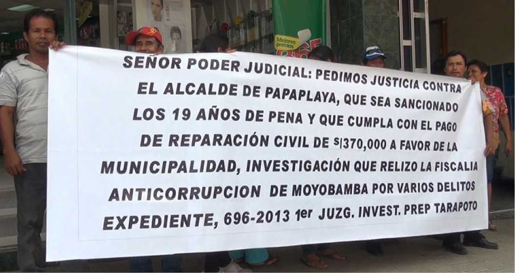 Los manifestantes con pancartas y banderolas protestaron por dos horas, exigiedo justicia, para que el alcalde de Papaplaya sea sancionado con pena privativa de la libertad, porque representantes de la Fiscalía Anticorrupción encontraron indicios de enriquecimiento ilícito, tal como lo denunciaron ante el Primer Juzgado de Investigación Preparatoria de Tarapoto, con el expediente 696 – 2013,