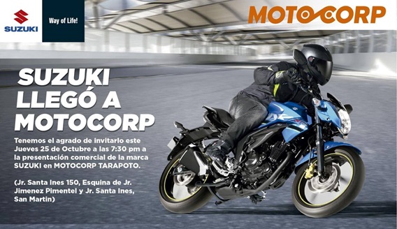 Motocorp anuncia para hoy jueves 25 de octubre a horas 7.30 de la noche, la presentación comercial de la marca Suzuki, la marca con 81 años en el mercado y una de las fabricantes más importantes del mundo de vehículos de 2 y 4 ruedas, y que se ubica también dentro de las tres marcas japonesas más importantes y con más ventas a nivel mundial, una actividad a la que ha invitado a medios de comunicación, así como distinguidas personalidades.