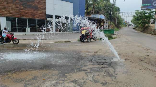 El hecho se produjo en la intersección de la avenida Perú con el jirón Sevilla, cerca del puente Cumbaza, la presión del agua era tan fuerte que en cuestión de minutos fueron lavados cerca de ocho trimóviles, cuyos conductores aprovecharon la oportunidad para ahorrar ocho soles ya que en los lavaderos les cobran esa cantidad.