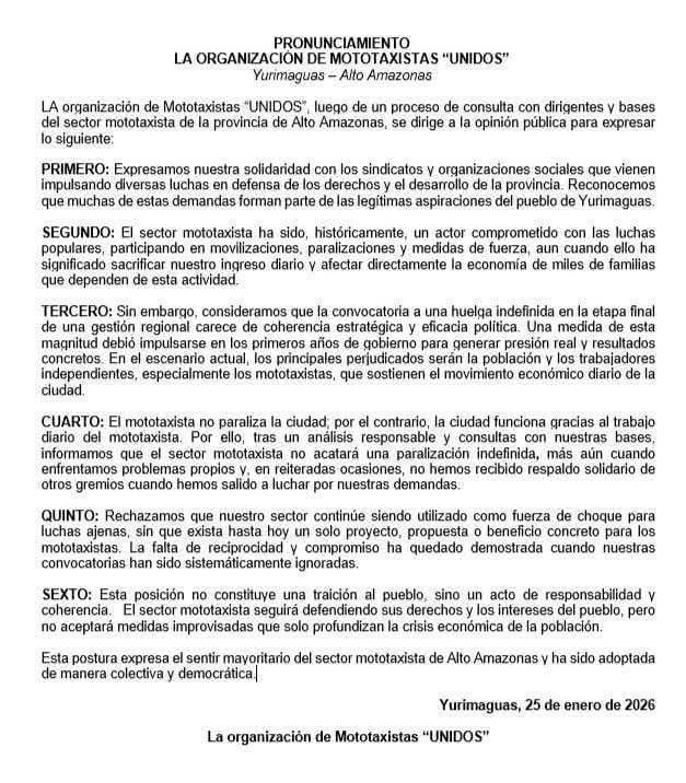 La Organización de Mototaxistas “UNIDOS” de Yurimaguas, tras un proceso interno de consulta con dirigentes y bases del sector mototaxista de la provincia de Alto Amazonas, emitió un pronunciamiento público en el que fija una posición clara frente a la actual convocatoria a una huelga indefinida, expresando solidaridad con las luchas sociales, pero rechazando medidas improvisadas que, lejos de generar soluciones reales, terminan afectando directamente a la población y a los trabajadores independientes.