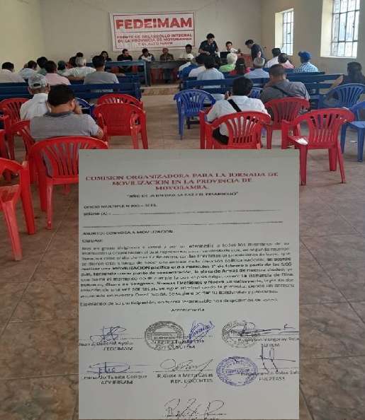 Se realizará una movilización este miércoles 01 de febrero, a partir de las 5 de la tarde con punto de concentración en la plaza de Armas, según acuerdo tomado en una asamblea ampliada, manifestó, Juan José Becerra Ayala, presidente del Frente de Defensa de Moyobamba y el Alto Mayo (FEEIMAM).