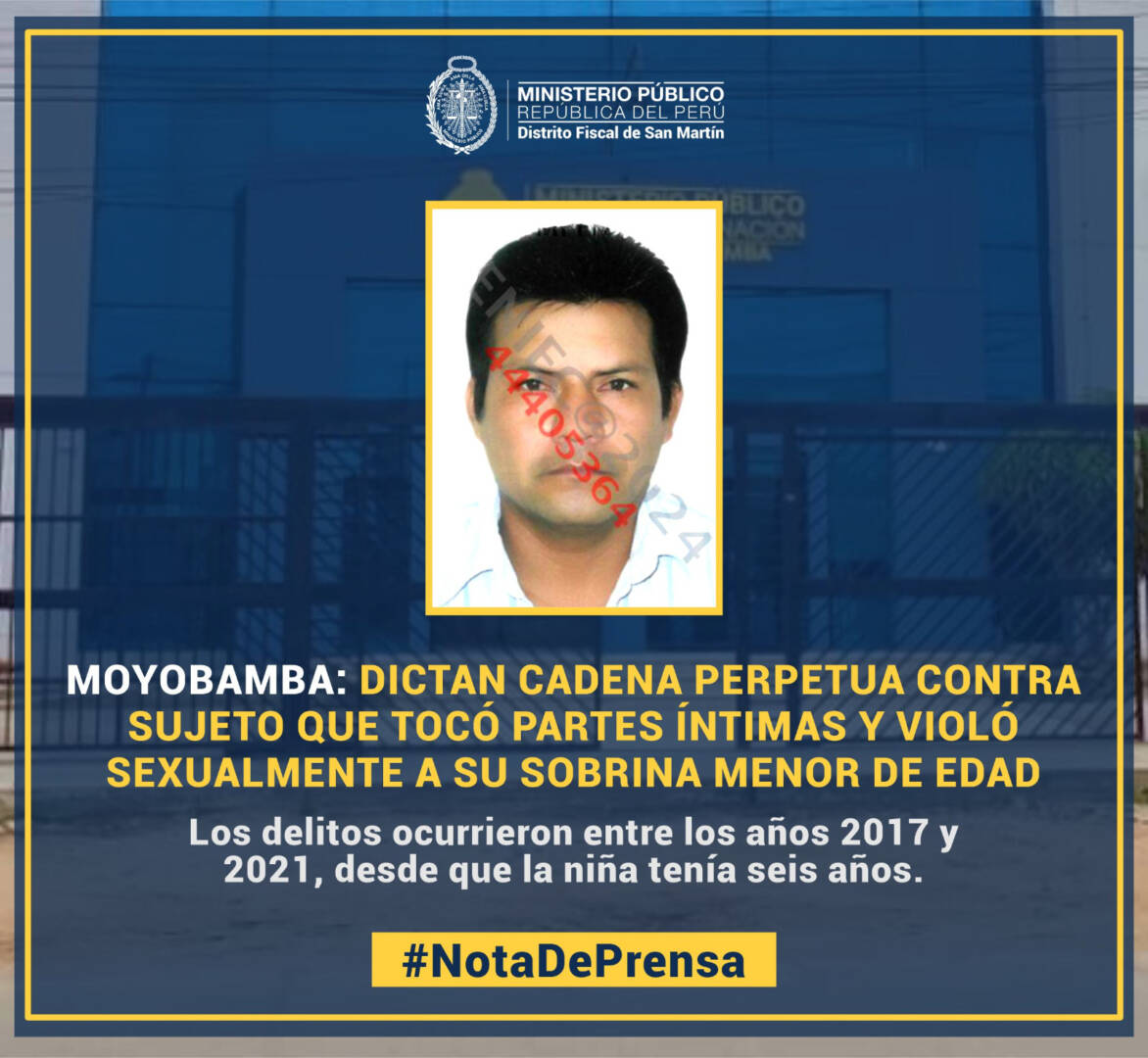 La Fiscalía Provincial Penal Corporativa de Moyobamba consiguió que se dicte cadena perpetua a Jalinton Pisco Guerra (43), quien fue hallado culpable por el concurso real de los delitos de tocamientos indebidos y violación sexual de su sobrina menor de edad, ambos perpetrados entres los años 2017 y 2021, en la ciudad de Moyobamba, San Martín.