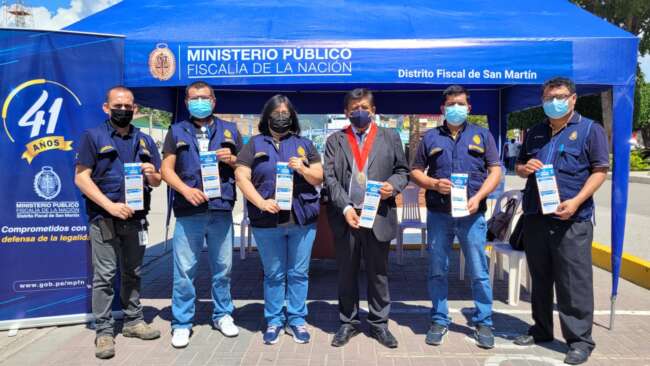La entidad se hizo presente con un stand informativo instalado en la plaza de Armas de Moyobamba, donde, este miércoles, el equipo de la Fiscalía Provincial de Prevención del Delito de Moyobamba, a cargo de la fiscal provincial Olga Uberlit Salazar Delgado, entregó al público material publicitario y volantes con información referida a la formas de captación de las víctimas de trata de personas, sanciones penales y canales de atención y denuncia.