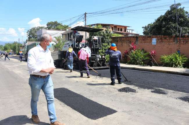 El alcalde provincial Tedy del Aguila Gronerth, visitó los trabajos de asfaltado que ejecuta la MPSM en el Jr. Ramón Castilla de la ciudad de Tarapoto.