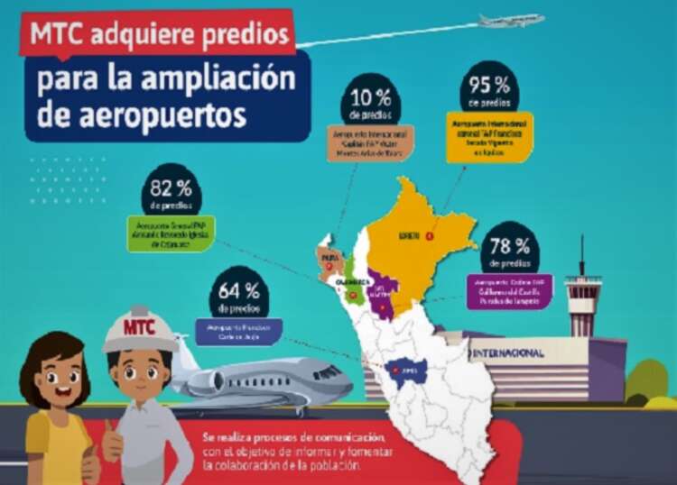 En el caso del Aeropuerto Internacional Coronel FAP Francisco Secada Vignetta, en Iquitos, el sector adquirió el 95% de inmuebles. En cuanto a las intervenciones en el Aeropuerto Internacional Capitán FAP Víctor Montes Arias, en Talara, se ha adquirido el 10% de propiedades necesarias.