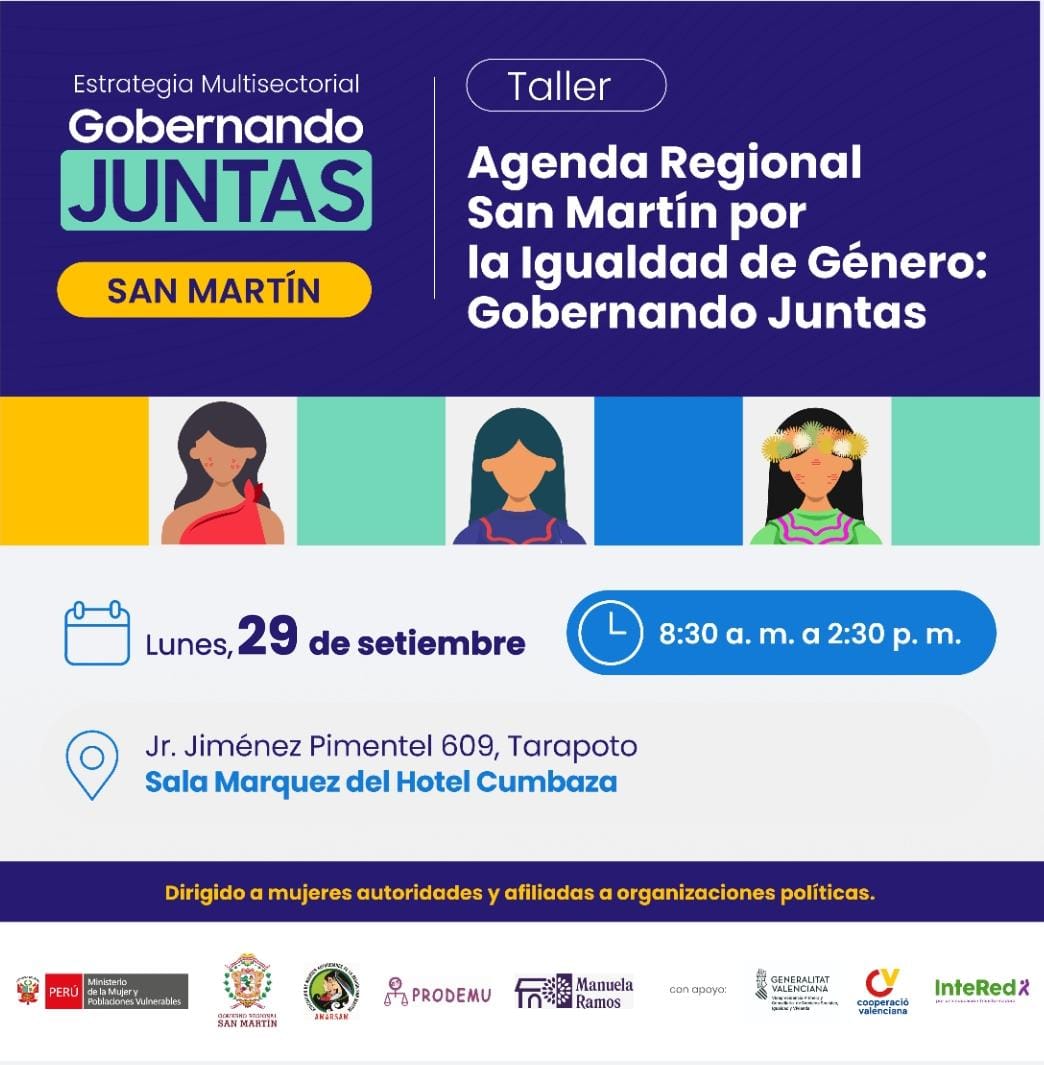 El Ministerio de la Mujer y Poblaciones Vulnerables (MIMP), en el marco de la Estrategia Multisectorial Gobernando Juntas, junto al Gobierno Regional de San Martín y la Asociación de Mujeres Autoridades de la Región San Martín (AMARSAM), coorganizan el Taller Agenda Regional San Martín por la Igualdad de Género: Gobernando Juntas, un espacio histórico y participativo para definir las prioridades de las mujeres autoridades de la región.