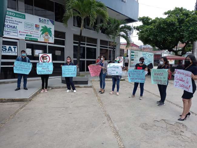 No pararán hasta que lo capturen, mujeres organizadas en diferentes estamentos, la mañana de ayer miércoles hicieron sentir su voz de protesta a la ciudadanía tarapotina, pidiendo la captura de César Oscar La Barrera Martínez (54), quien es sindicado del asesinato de su exconviviente Jenny Jéssica Rojas Aranda (35) y su mejor hija de iniciales LCLR. Por tal motivo realizaron un plantón en el frontis de la Municipalidad Provincial de San Martín, exigiendo a la Policía y al Ministerio Público, la pronta captura de La Barrera Martínez, porque existe el peligro de cruzar la frontera hacia el Ecuador y el crimen quede impune.