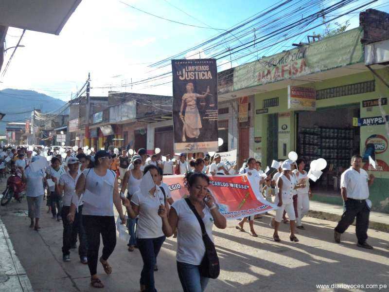 JUANJUI.-Ayer las autoridades y pueblo de Juanjuí se volcaron a las calles protestando contra la espiral de violencia que ha segado la vida de muchos ciudadanos y ha puesto en zozobra la tranquilidad de esta zona de la región San Martín. El reciente crimen del Ing. Luis Lanares Paredes, así como el asesinato de César Santillán, el secuestro del ganadero Carlos Hidalgo Rengifo y otros ocasionados por manos asesinas y que aun duermen en la impunidad, han motivado la reacción de la población que salió a movilizarse en contra de los que atentan el bienestar y desarrollo de la sociedad. La multitud luego de arribar por diversos frentes, se juntaron en la Concha Acústica de San Juan donde iniciaron la movilización por las calles céntricas, concentrándose en la Plaza de Armas de Juanjuí, donde el alcalde y los familiares de las víctimas exigieron acciones efectivas a las autoridades para acabar con los actos de violencia que buscan sembrar temor y barbarie en el pueblo.