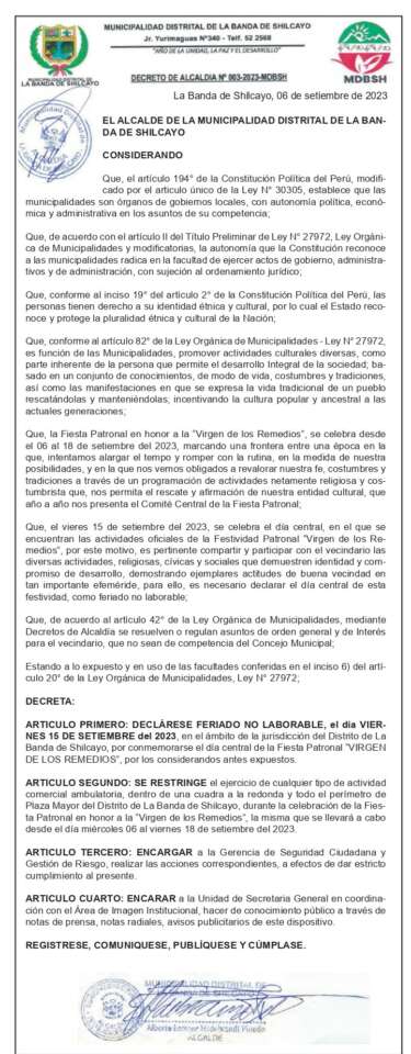 Municipalidad Distrital de la Banda de Shilcayo: Decreto de Alcaldía N° 003-2023-MDBS