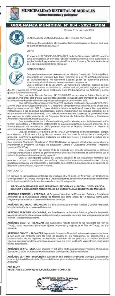 Municipalidad Distrital de Morales: Ordenanza Municipal N° 004-2023-MDM