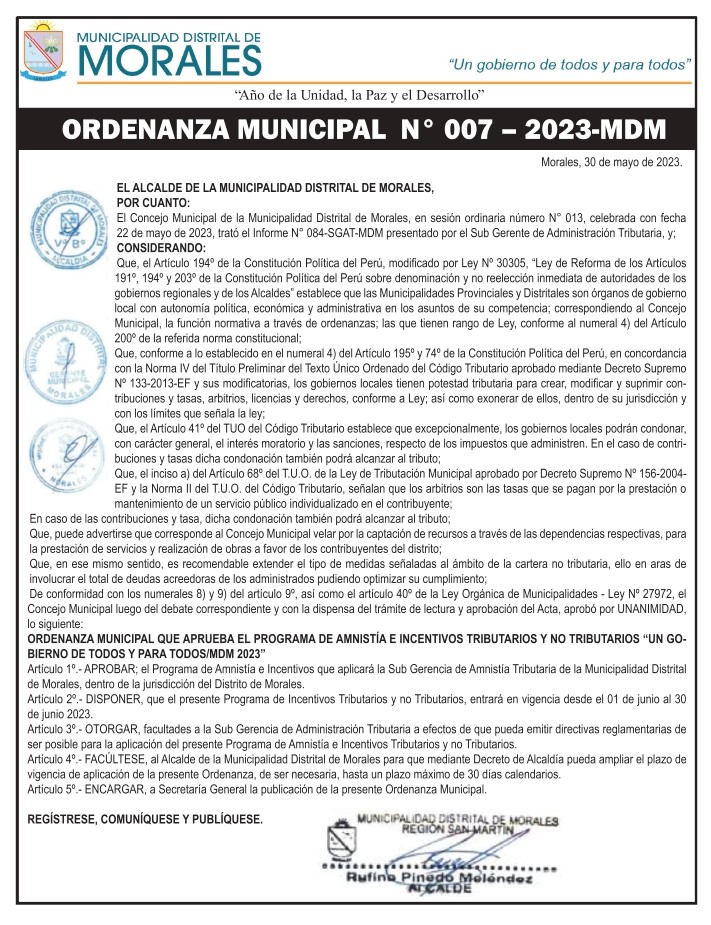 Municipalidad Distrital de Morales: Ordenanza Municipal N°007-2023-MDM