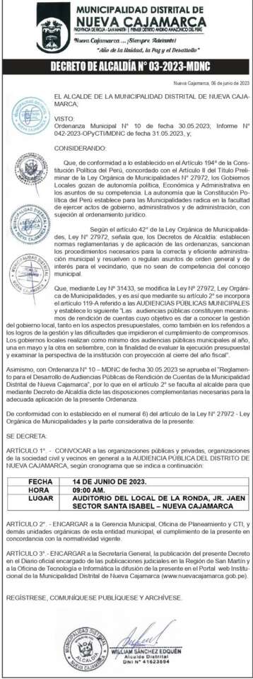 Inicio » Actualidad » Municipalidad Distrital de Nueva Cajamarca: Decreto de alcaldia N° 03-2023-MDNC