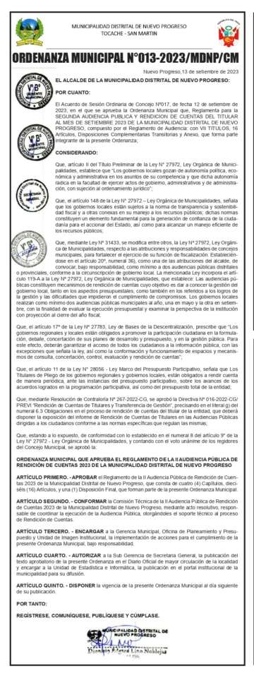 Municipalidad Distrital de Nuevo Progreso: Ordenanza Municipal N° 013-2023-MDNP/CM