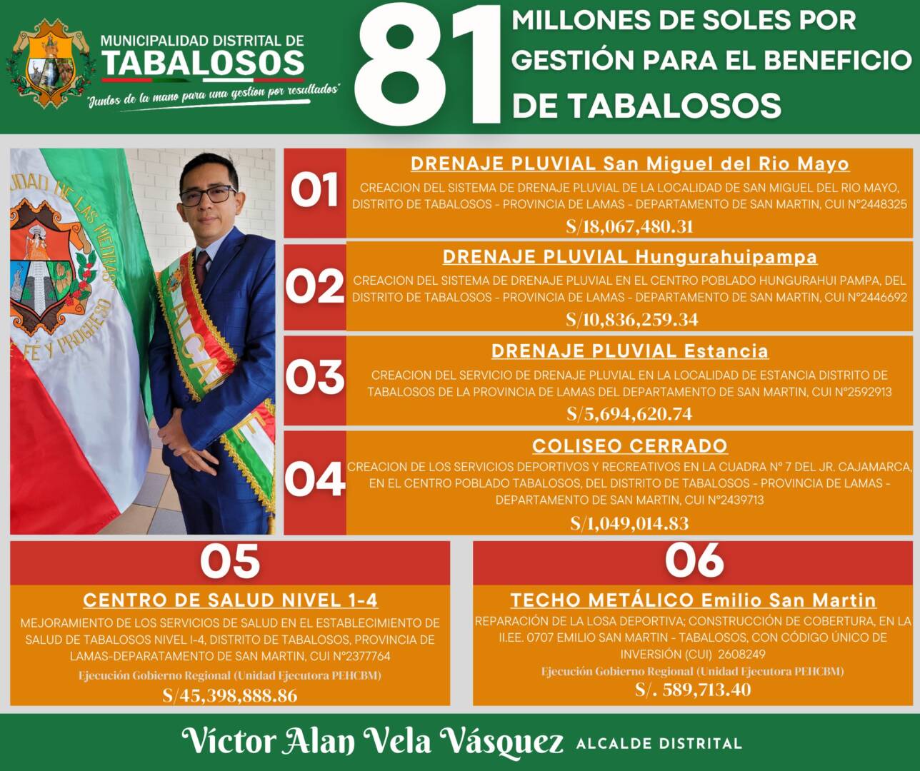 El alcalde de Tabalosos, Abg. Víctor Alan Vela Vásquez, mediante «GESTIÓN», logró conseguir los presupuestos de 6 grandes obras que se ejecutarán en el año 2024, que beneficiarán a la población tabalosina y sus anexos, creando puestos de trabajo para los vecinos.