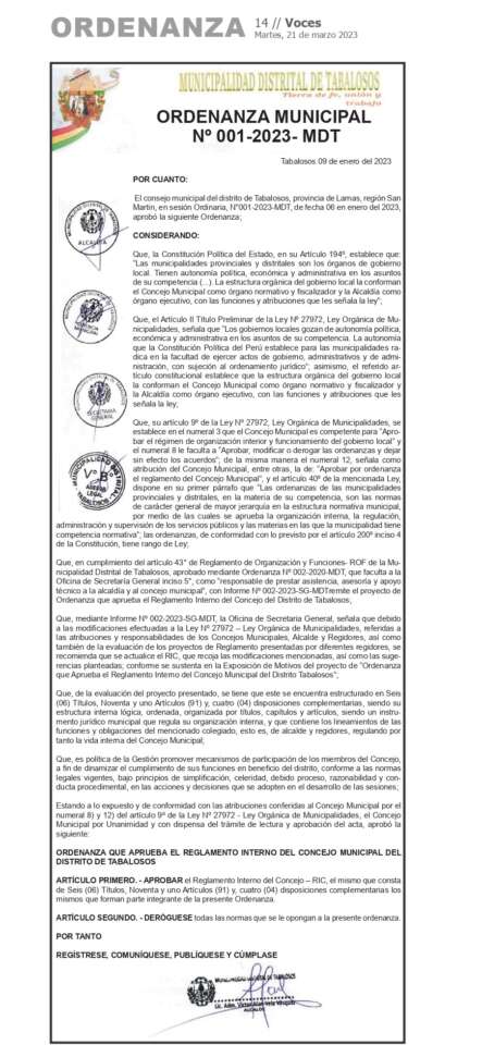 Municipalidad Distrital de Tabalosos: Ordenanza Municipal N° 001-2023-MDT