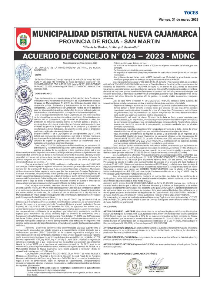 Municipalidad Distrital Nueva Cajamar: Acuerdo de Concejo N° 024-2023-MDNC