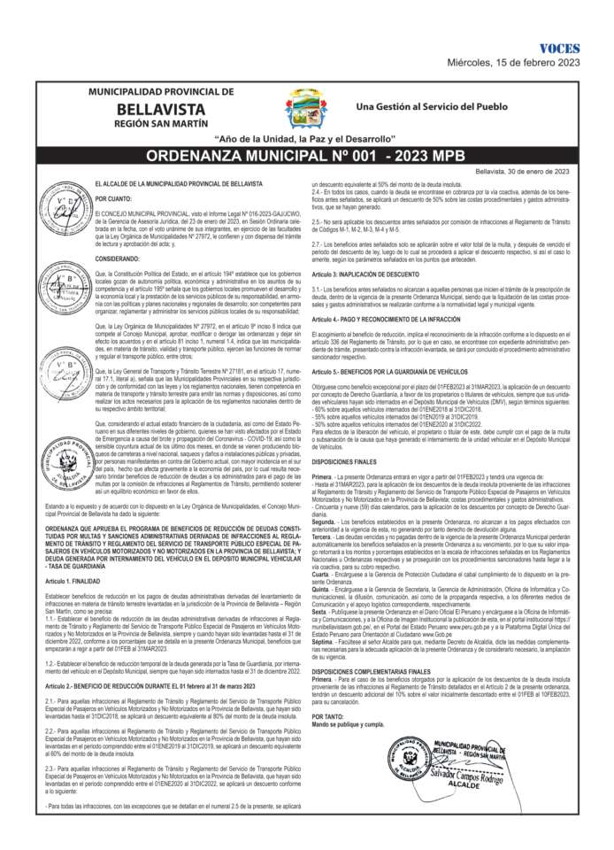 Municipalidad Provincial de Bellavista: Ordenanza Municipal N° 001-2023-MPB