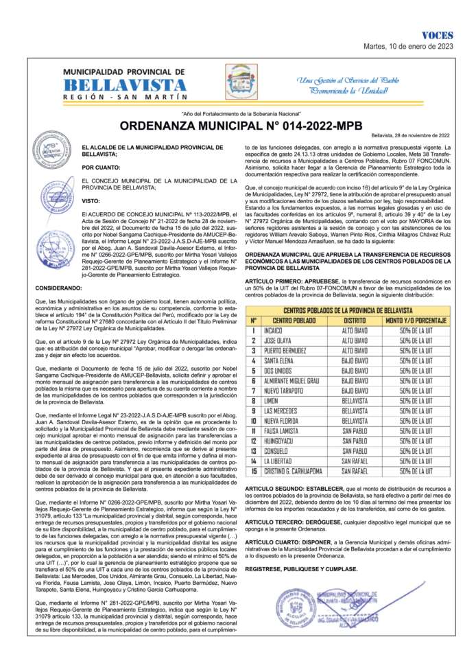 Municipalidad Provincial de Bellavista: Ordenanza Municipal N° 01-2022-MPB