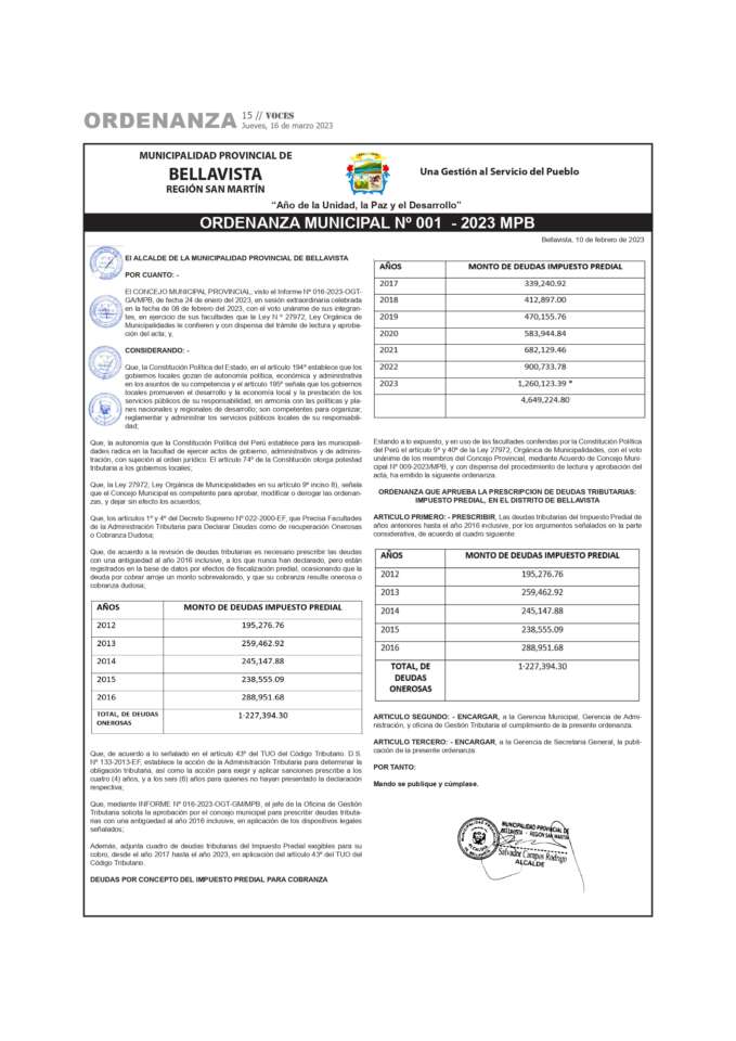Municipalidad Provincial de Bellavista: Ordenanza Municipal N° 01-2023-MPB,Ordenanza Municipal N° 02-2023-MPB,Ordenanza Municipal N° 03-2023-MPB,Ordenanza Municipal N° 04-2023-MPB,Ordenanza Municipal N° 05-2023-MPB