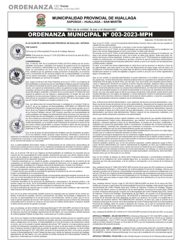 Municipalidad Provincial de Huallaga: Ordenanza Municipal N° 003-2023-MPH