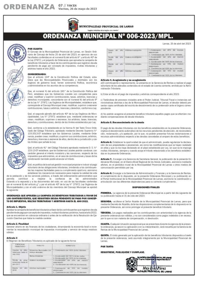 Municipalidad Provincial de Lamas: Ordenanza Municipal N°006-2023-MPL