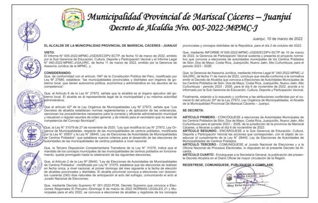 Municipalidad Provincial de Mariscal Cáceres – Juanjui : Decreto de Alcaldia N° 005-2022-MPMC-J