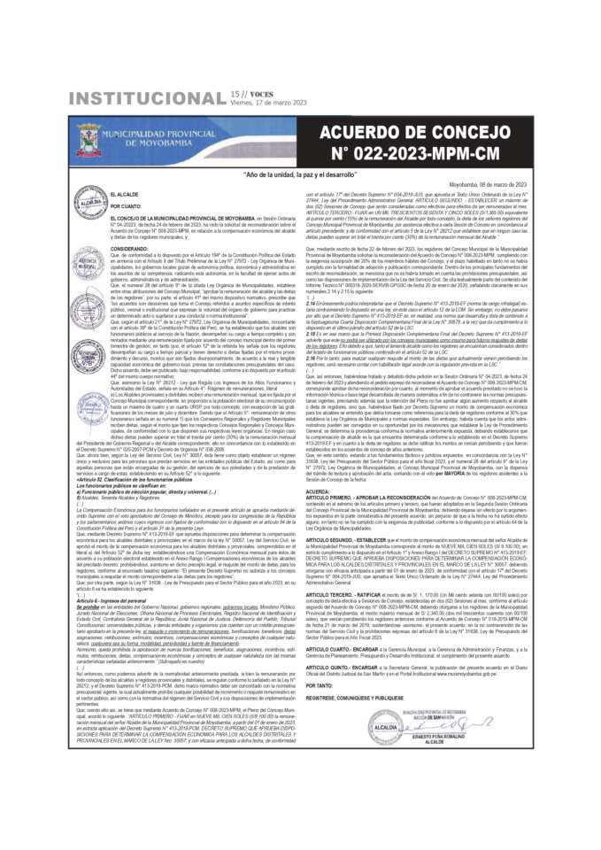 Municipalidad Provincial de Moyobamba: Acuerdo de Concejo N° 022-2023-MPM-CM