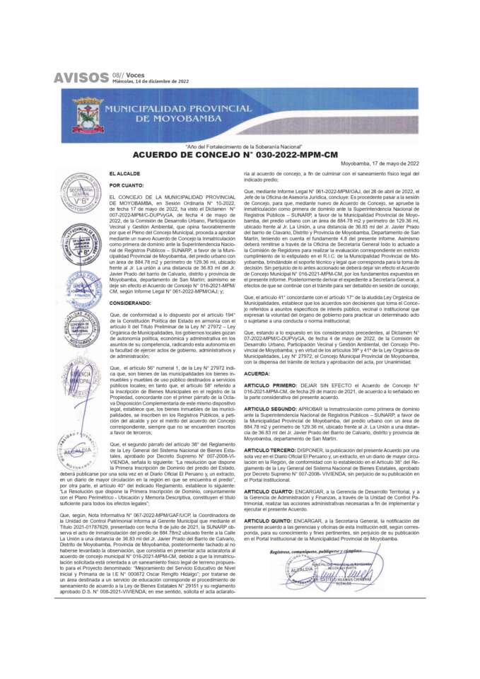 Municipalidad Provincial de Moyobamba: Acuerdo de Concejo N° 030-2022-MPM-CM