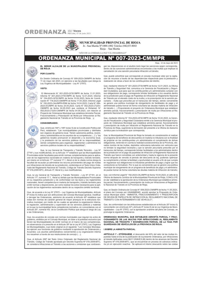 Municipalidad Provincial de Rioja: Ordenanza Municipal N° 007-2023-CM/MPR